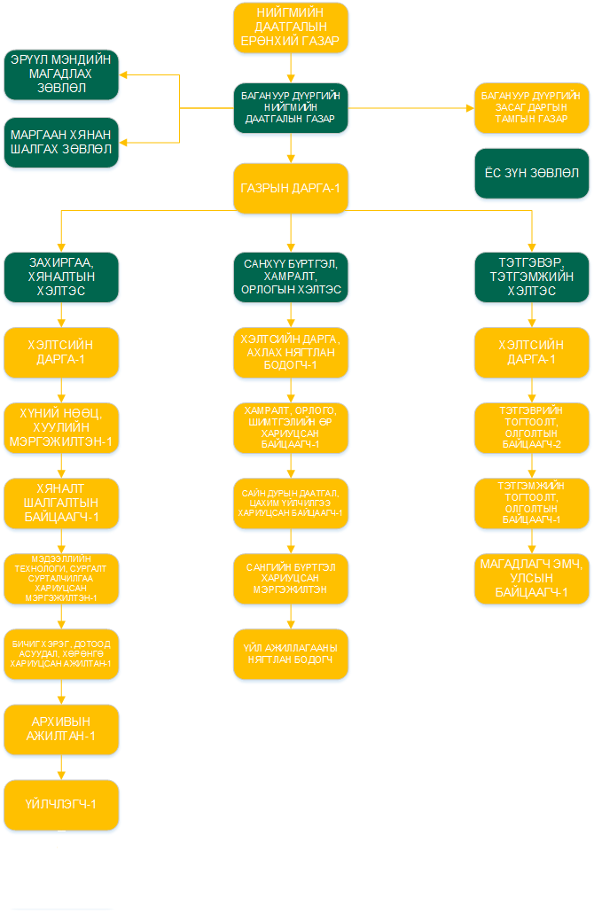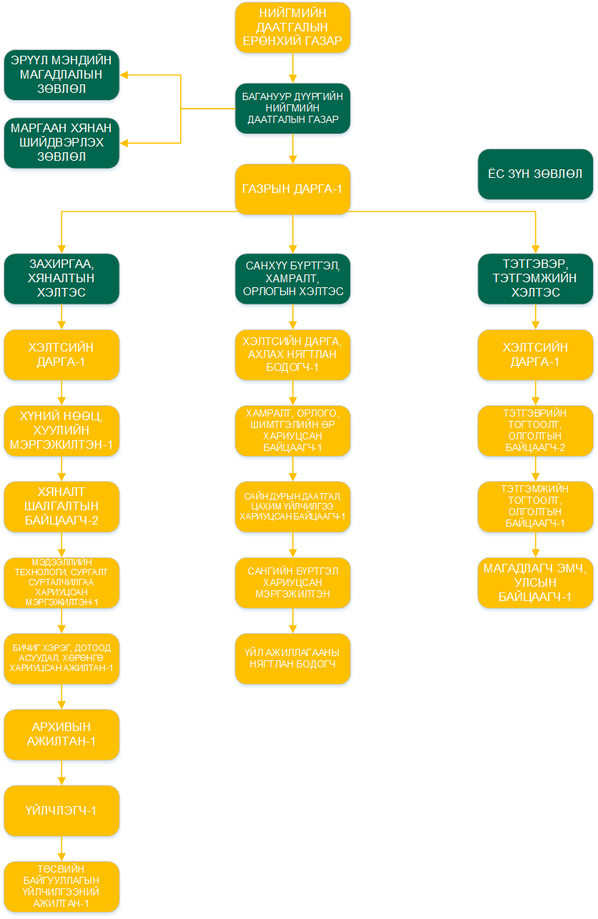 - Төрийн захиргааны удирдлагын манлайллыг хангах, бодлогын баримт бичиг, хууль тогтоомж, тогтоол шийдвэрийн эрх зүйн үндэслэлийг судалж, хэрэгжилтийг хангах, төлөвлөх, тайлагнах, хүний нөөцийн бодлого, төлөвлөлтийг оновчтой зохион байгуулах, нийгмийн даатгалын үйлчилгээг хөгжүүлэх замаар байгууллагын тогтвортой хөгжлийг хангах;